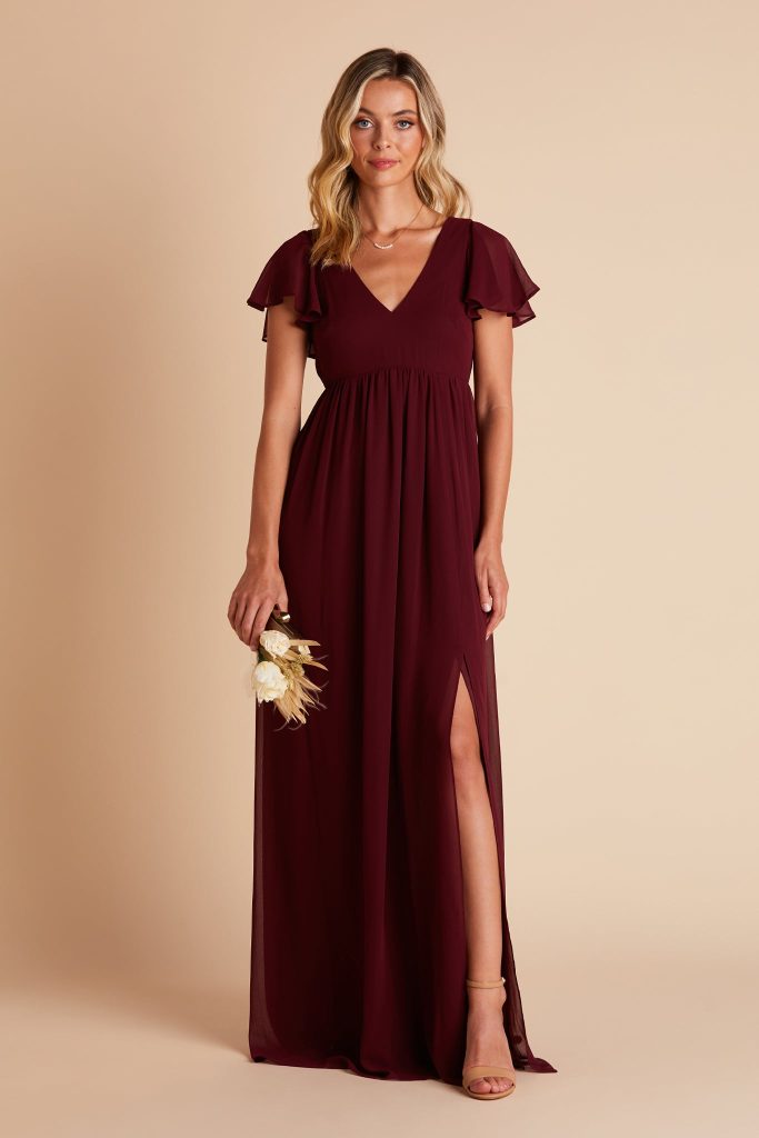 Finally, there’s the Hannah Empire Dress in Cabernet, which combines a flattering empire waist with just the right touch of romance. The gentle pleats and flowy skirt add an elegant twist, and the classic color means it’ll complement almost any wedding palette.